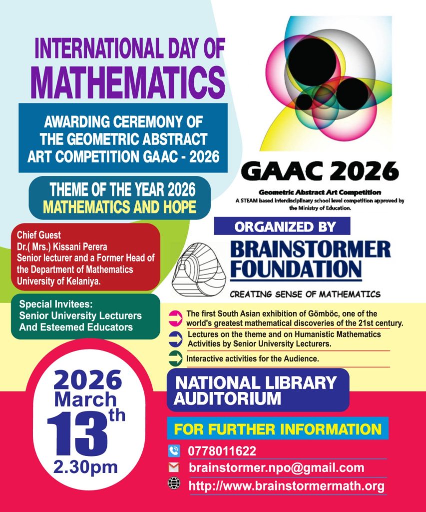 Brainstormer Foundation proudly celebrated the International Day of Mathematics on 14th March 2025 at the National Library Auditorium with the participation of Academics, Officials in Education, School teachers and students. Awarding of certificates to the winners of Geometric Abstract Arts competition and the Launch of ‘Brainstormer’ book (the first publication of the foundation) took place during the event.